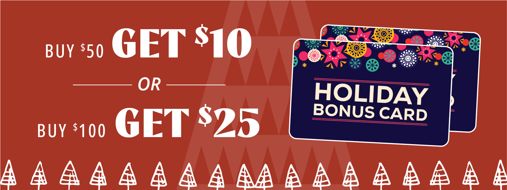 Buy some, get some. From 11/4/25 — 12/31/25, receive a $10 bonus cards for every $50 gift card purchased & a $25 bonus card for every $100 gift card purchased. Available online and in-store.